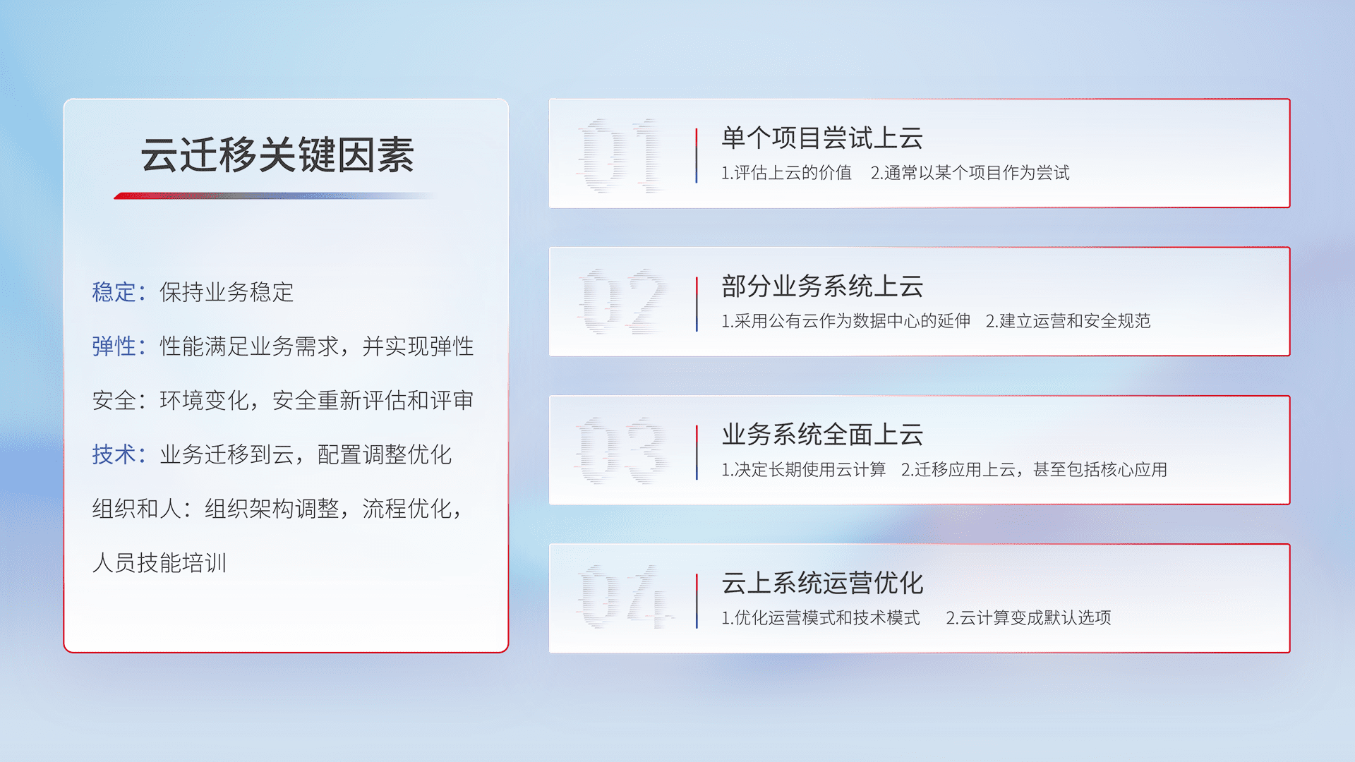 结合实际业务,,,,从规划设计、、云平台选型、、、、云原生改造、、、、数据迁移、、集成交付,,,,迁移全过程为客户识别最佳上云路径,,做好风险识别管理,,,,设计网络架构、、、、身份权限、、、、安全审计合规、、、操作审计、、日志审计、、监控告警策略、、、、多站点容灾设计等,,对云上基础设施进行整体规划,,,,提升IT治理水平,,,以满足弹性、、、高可用、、、高性能的需求。。。。